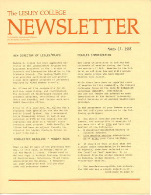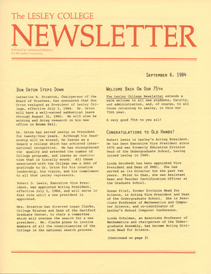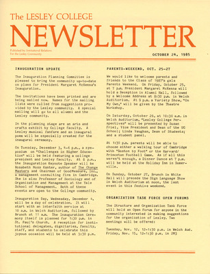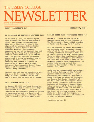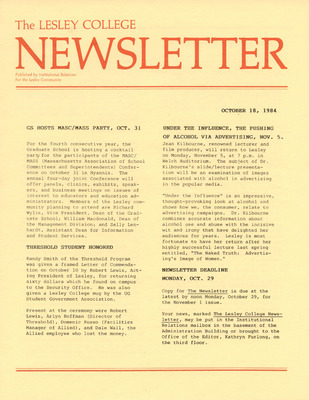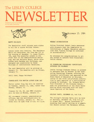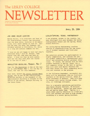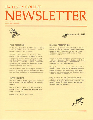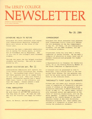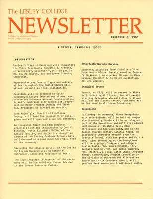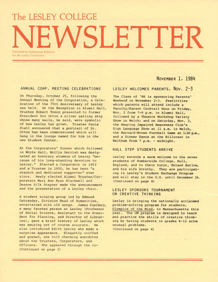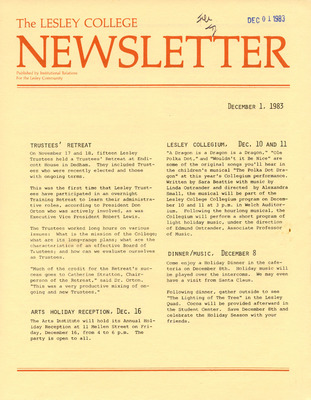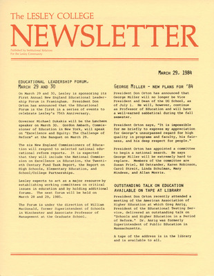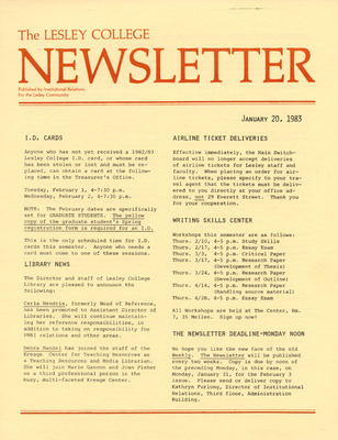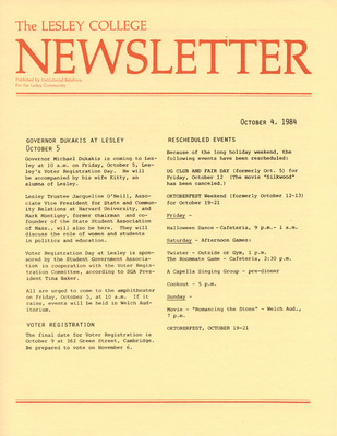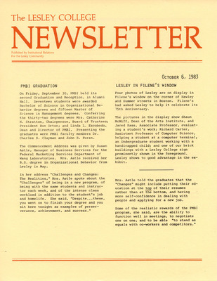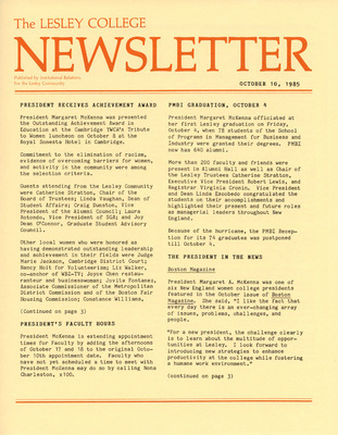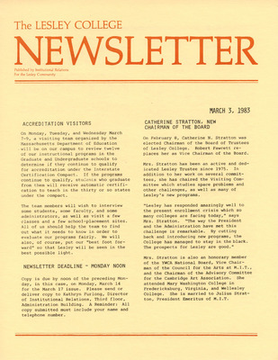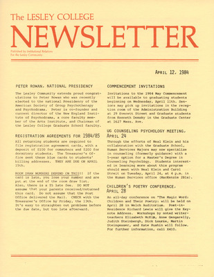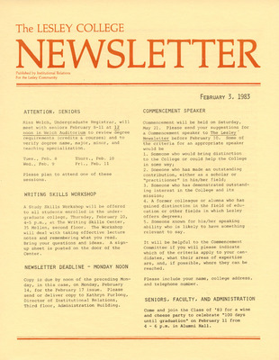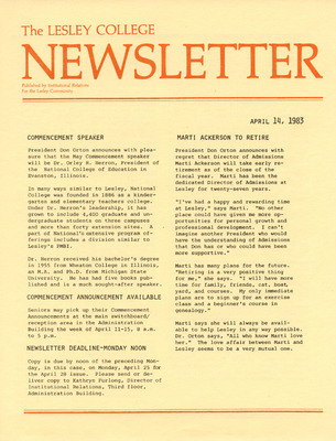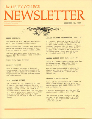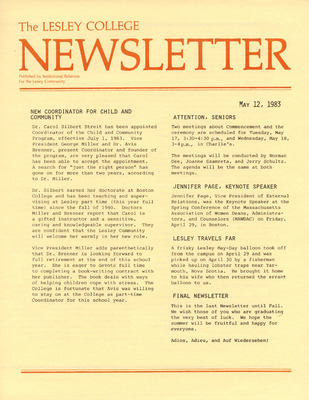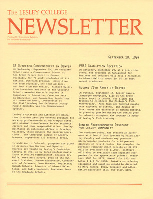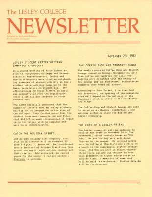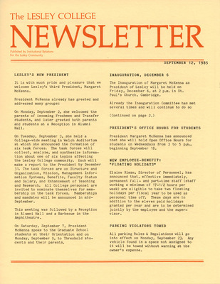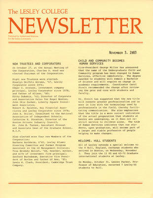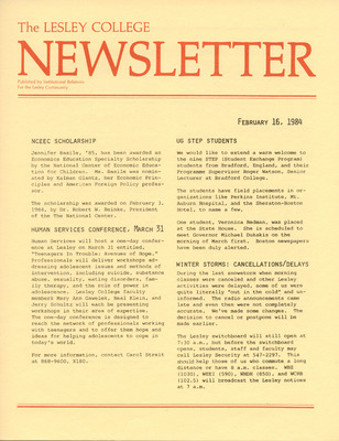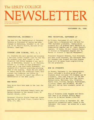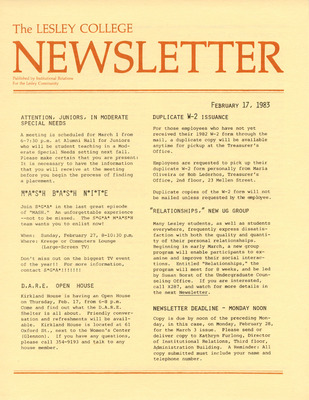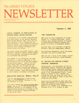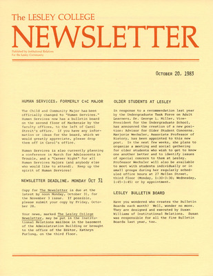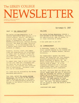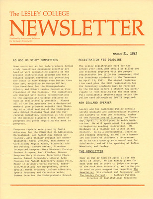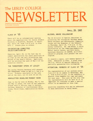 A newsletter published weekly during the school year by the Lesley College Institutional Relations for the Lesley Community from 1983-1987.